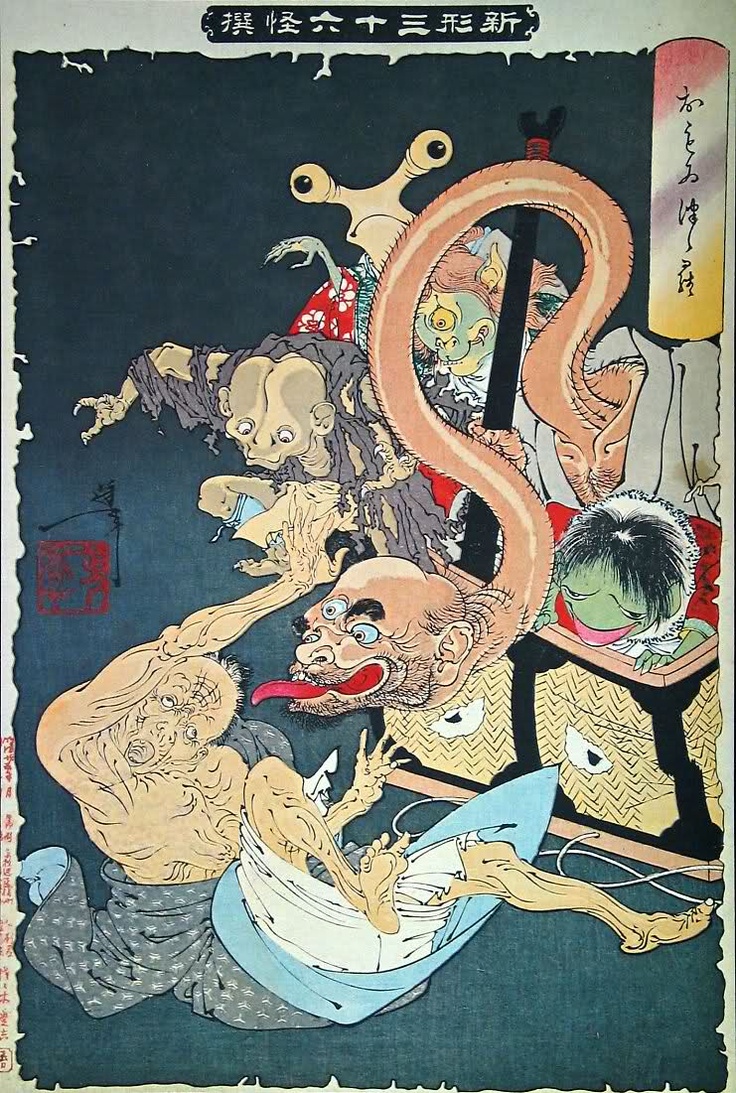 Volviendo al mundo de los espectros y entes, se puede encontrar en el folclore e iconografía japonesa un amplio listado de seres que se mueven entre la frontera de lo invisible y espiritual, y la dimensión cotidiana del ser humano.